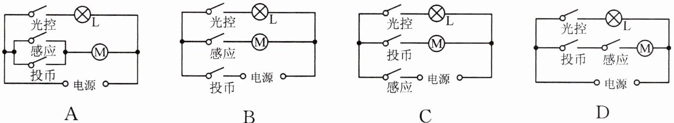 8. 现在,很多小区都安装了自动售水机。售水机既可以通过刷卡闭合“感应开关”,接通供水电机取水,也可以通过投币闭合“投币开关”,接通供水电机取水;光线较暗时“光控开关”自动闭合,接通灯泡提供照明。以下简化电路符合要求的是( )。