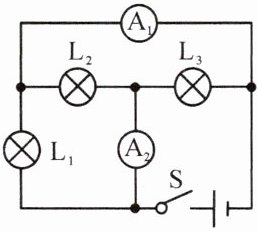 11. 如图所示的电路中,开关S闭合时,通过L₁的电流为0.2 A,通过L₂的电流为0.3 A,通过L₃的电流为0.4 A,则( )。
