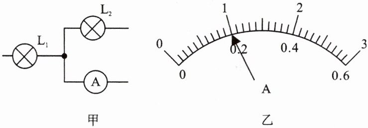 9. 图甲是由灯L₁、L₂组成的并联电路的一部分,各元件均正确连接,已知通过灯L₁的电流为0.6 A,电流表的示数如图乙所示,下列判断正确的是( )。