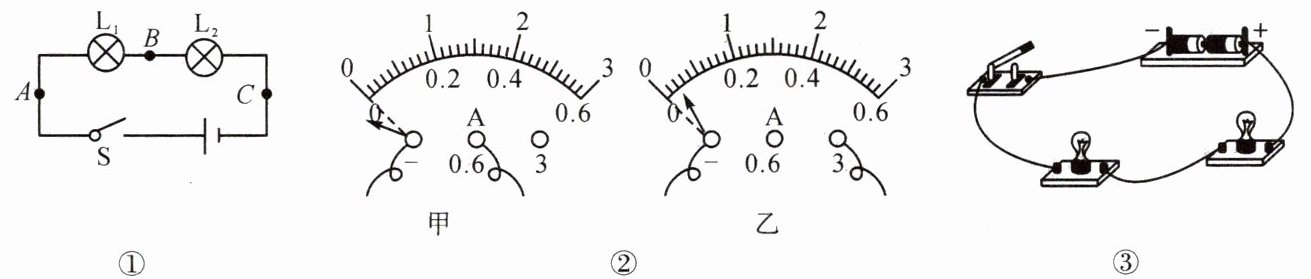 (5)小明同学实验结束后,把两个小灯泡串联接入如图③所示电路中,研究串联电路的特点。