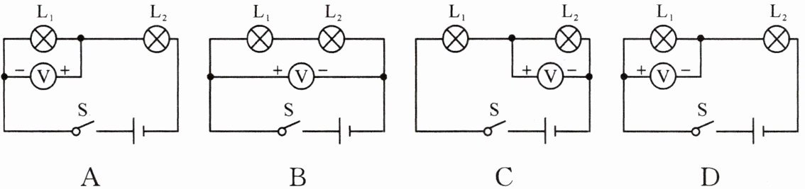 7. 如图,能正确地测出小灯泡L₁两端电压的电路是( )。
