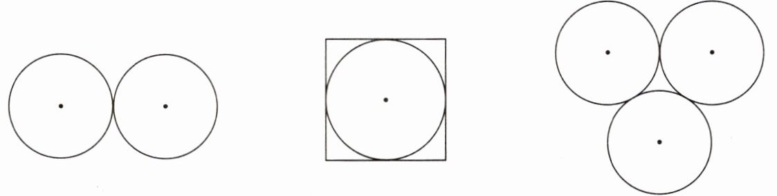 (注:因无法直接画图,对称轴描述如下:第一个图形为过两圆圆心的直线及两圆连心线的垂直平分线;第二个图形为正方形的两条对角线及两组对边中点连线;第三个图形为过每个圆的圆心与另外两个圆圆心连线夹角的平分线。)