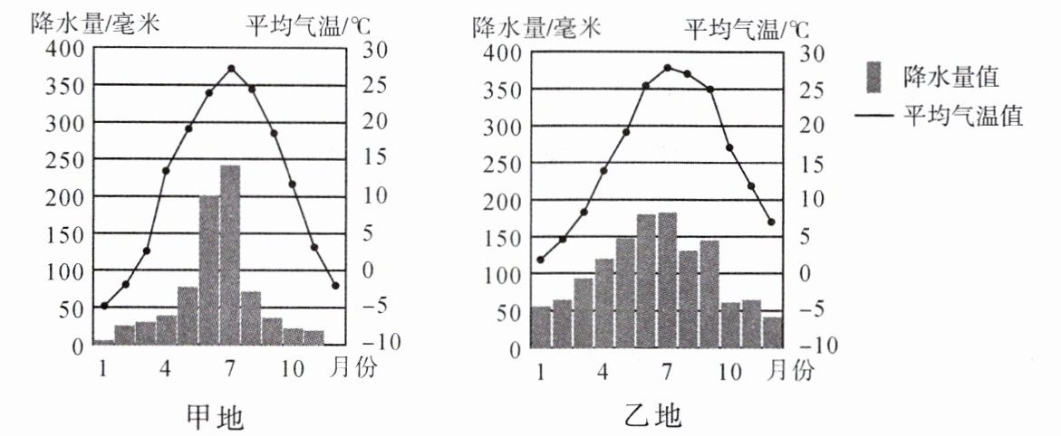 2.甲、乙两地中,降水季节分配更加不均的是______地,年降水总量比较多的是______地。