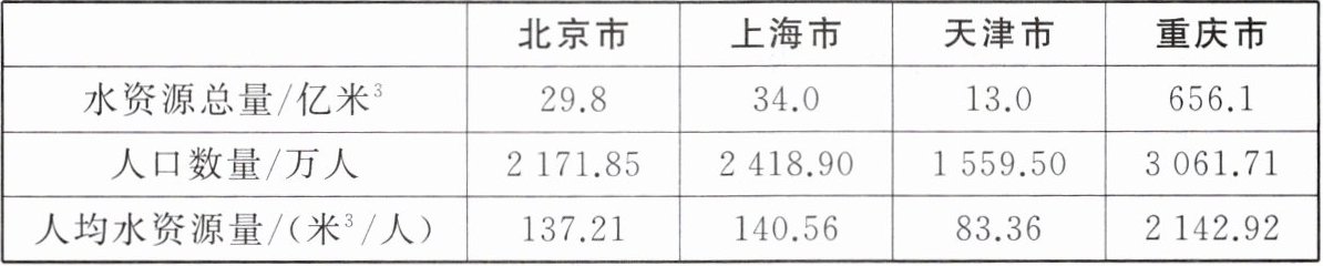 我国四个直辖市的水资源存在差异。读下表,回答1—3题。