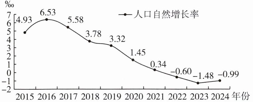 据2025年1月国家统计局发布的人口统计数据显示:我国2024年人口出生率为6.77‰,人口死亡率为7.76‰。下图为2015—2024年我国人口自然增长率变化曲线图。据此回答1—2题。