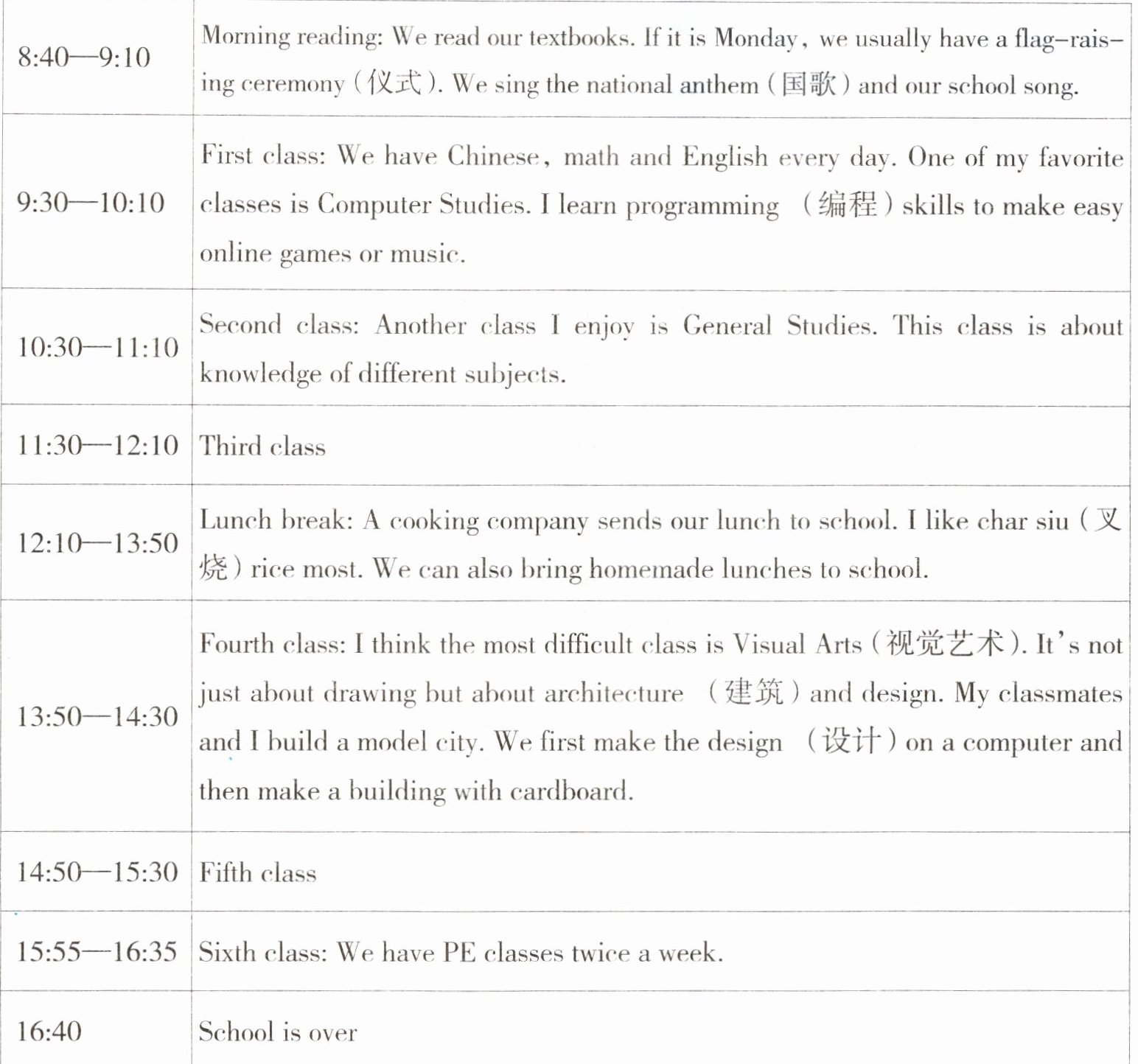 )60. Yin Xinyue’s school day last (持续) 8 hours and she thinks her school life is colorful.