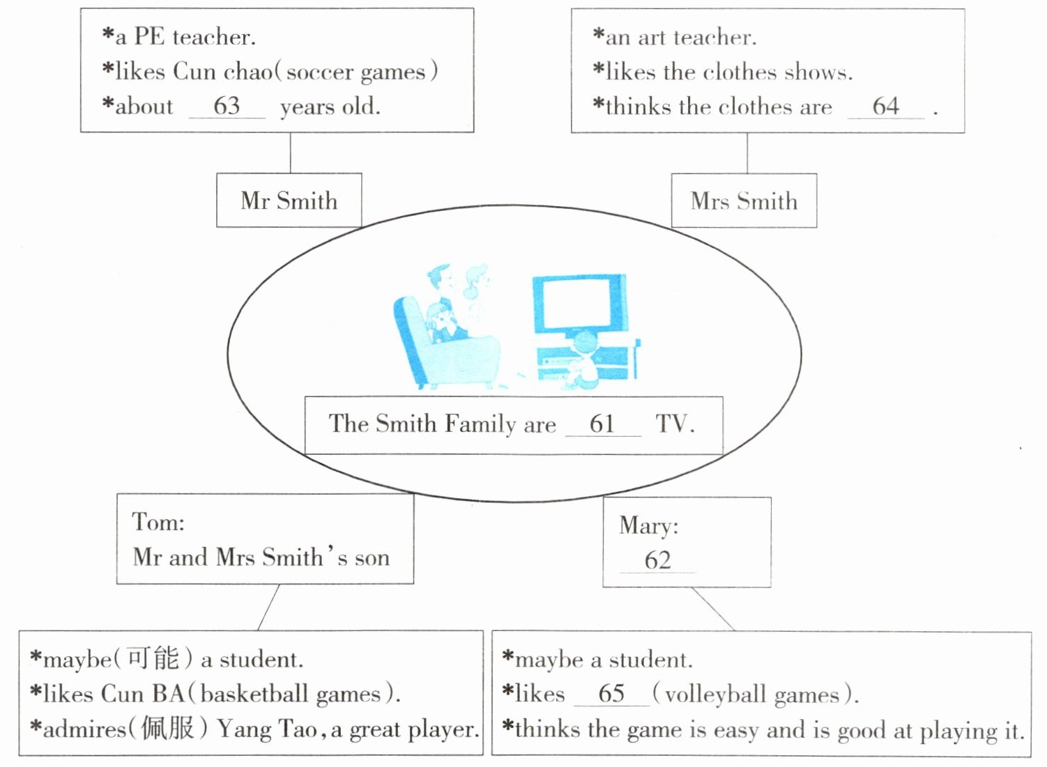 The Smiths love to watch the games very much. Mr Smith is a PE teacher. He likes watching Cun Chao best. Mr Smith’s birthday is on January 1st. He was born in 1980. In the new-year, he wants to watch the game in Gui Zhou one day. And Mrs Smith is an art teacher. She likes the clothes shows (秀) after the games. She says the clothes are beautiful. Their son, Tom, is 13 years old. He likes Cun BA very much. He thinks the basketball players play basketball well in the games. Mary, Tom’s sister, is 11 years old. She thinks soccer and basketball are difficult. She is good at volleyball because it’s easy for her. What games does she like? Do you know?