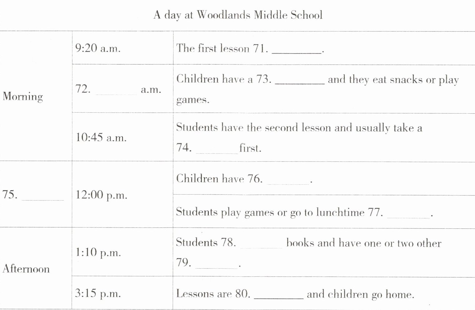 71. begins 72. 10:20 73. break/rest 74. test 75. Lunchtime 76. lunch