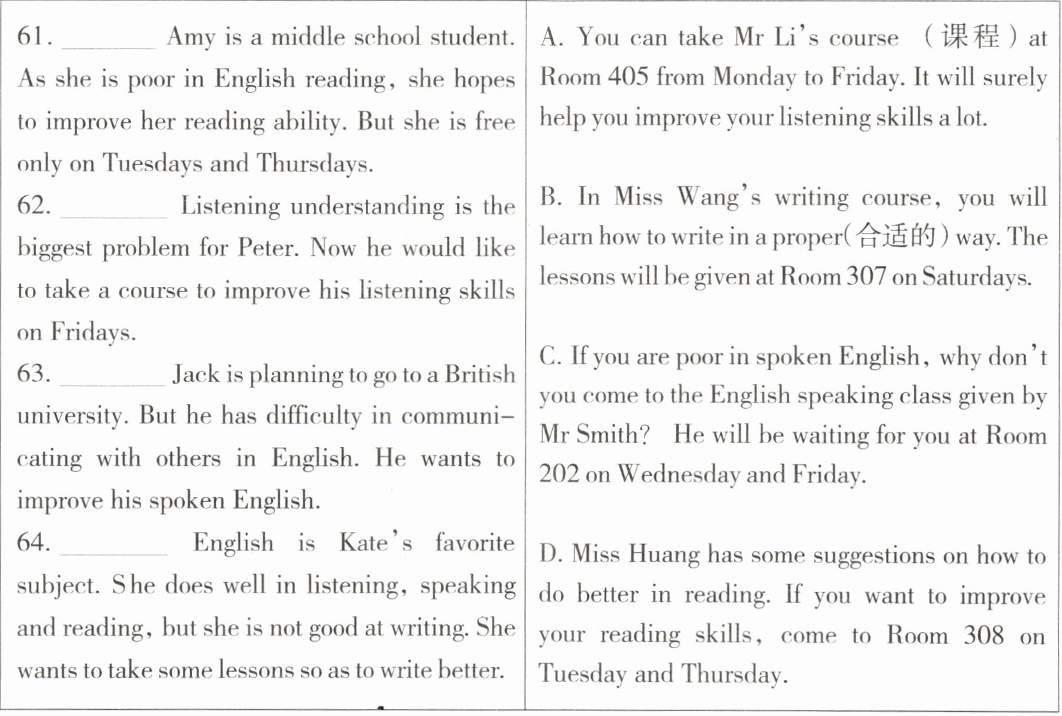 Amy is a middle school student. As she is poor in English reading, she hopes to improve her reading ability. But she is free only on Tuesdays and Thursdays.62.