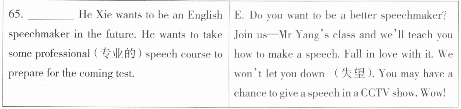 E. Do you want to be a better speechmaker? Join us—Mr Yang’s class and we’ll teach you how to make a speech. Fall in love with it. We won’t let you down (失望). You may have a chance to give a speech in a CCTV show. Wow!