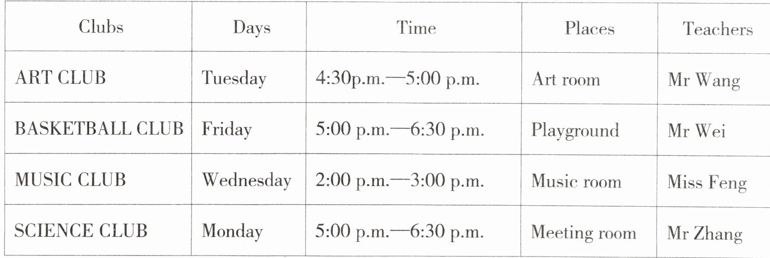 )2. Who is the teacher of the art club?A. Mr Wang.