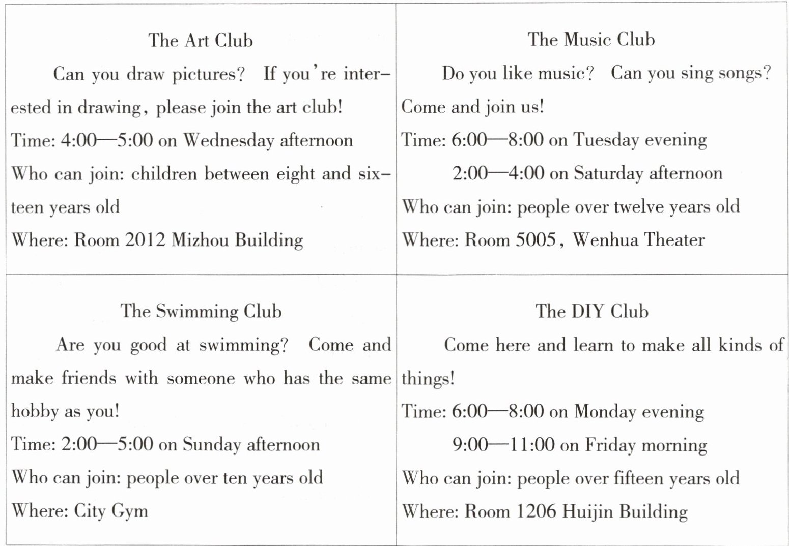 )50. Which of the following is NOT true?A. The Art Club is open twice (两次) a week.