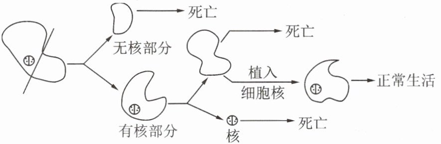 用一根玻璃针将一个变形虫(注:变形虫的身体只有一个细胞)切为两部分,有核部分能继续生活,无核部分很快死亡。如果将一个变形虫的细胞核取出,无核部分可短期生存,但不能繁殖后代,单独的细胞核则无法生存。如果在去细胞核后短时间内再植回一个细胞核,这个变形虫可以正常生活。据图完成填空。
