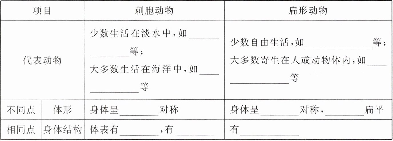 | 代表动物 | 少数生活在淡水中,如______等;大多数生活在海洋中,如______等 | 少数自由生活,如______等;大多数寄生在人或动物体内,如______等 |