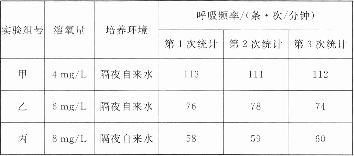 | 实验组号 | 溶氧量 | 培养环境 | 呼吸频率/(条·次/分钟) | | |