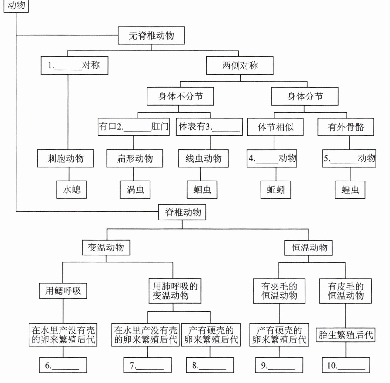 1. 辐射 2. 无 3. 角质层 4. 环节 5. 节肢 6. 鱼 7. 两栖动物 8. 爬行动物 9. 鸟 10. 哺乳动物