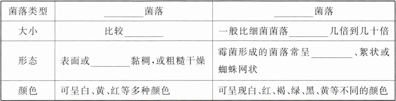 | 形态 | 表面或______黏稠,或粗糙干燥 | 霉菌形成的菌落常呈______、絮状或蜘蛛网状 |