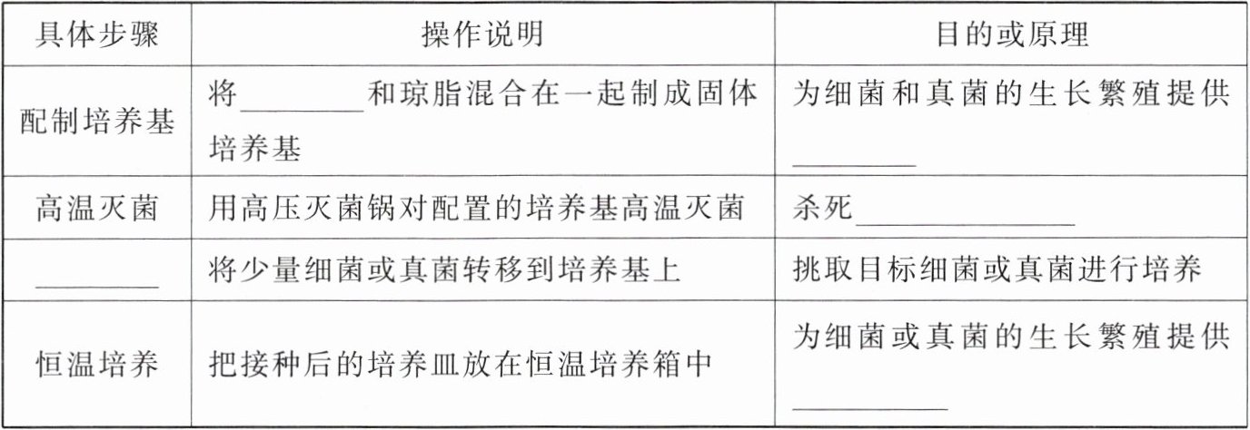 | 配制培养基 | 将______和琼脂混合在一起制成固体培养基 | 为细菌和真菌的生长繁殖提供______ |