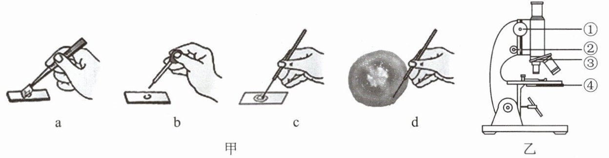小莹想了解番茄,于是用显微镜观察番茄果肉细胞临时装片并查找相关资料。图甲是番茄果肉细胞临时装片的制作过程图,图乙是显微镜结构图。