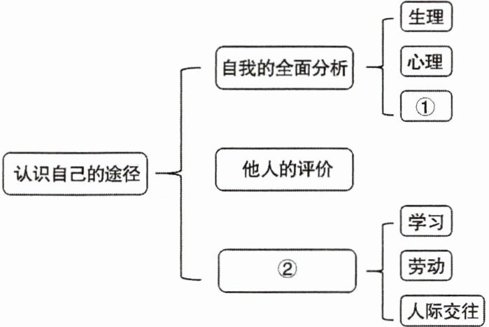 (2)①我们可以通过对自我的全面分析来认识自己。我们可以从生理、心理、社会关系等方面来认识自己。②我们可以通过他人的评价来认识自己。他人的评价是我们认识自己的一面镜子。我们要客观冷静地对待他人的评价,既不盲从也不轻视。③我们可以在生活实践中认识自己。学习、劳动、人际交往等生活实践,能够让我们更加了解自己的优势和不足。④认识自己是一个过程。随着年龄的增长、知识的积累、视野的开阔,我们不断发展自己、完善自己。
