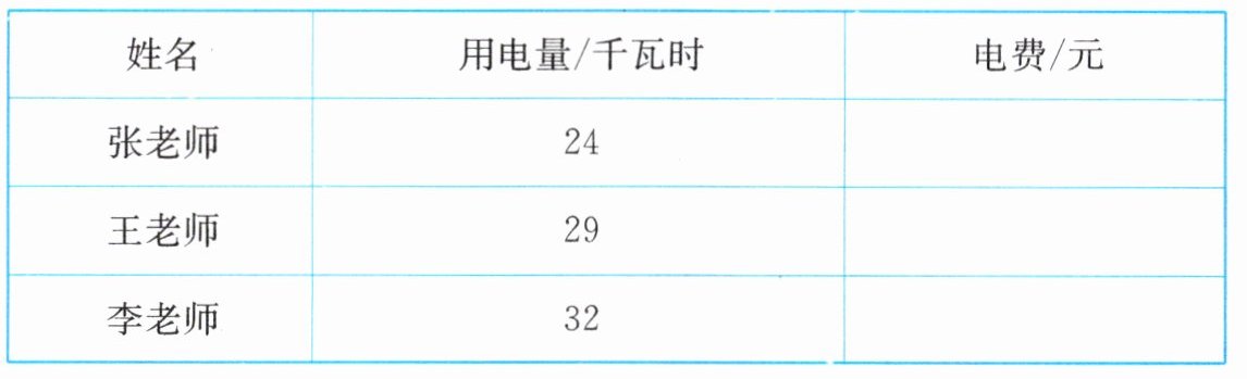 学校规定,月用电量超过25千瓦时,超过部分按0.65元/千瓦时计费,不超过25千瓦时按0.45元/千瓦时计费。请你算出下表中三位老师上月应付的电费。