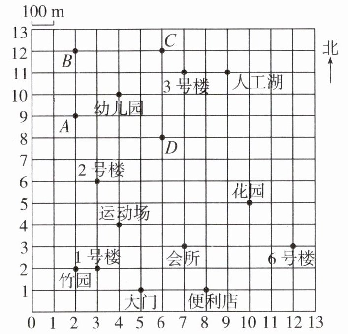 5. 3号楼在会所的$(\quad)$面,运动场的$(\quad)$面是竹园。儿童乐园在幼儿园的西北面,图上A、B、C、D四个点,点$(\quad)$是儿童乐园的位置。