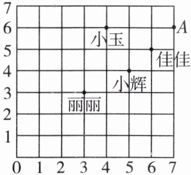 2. 图中点$A用(7,6)$表示。你能根据下面的位置说明写出丽丽、小玉、小辉、佳佳家的坐标吗?