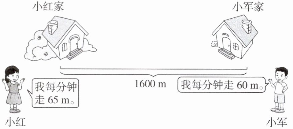 1. 小红和小军同时从家中出发,相向而行。经过多少分钟两人相遇?