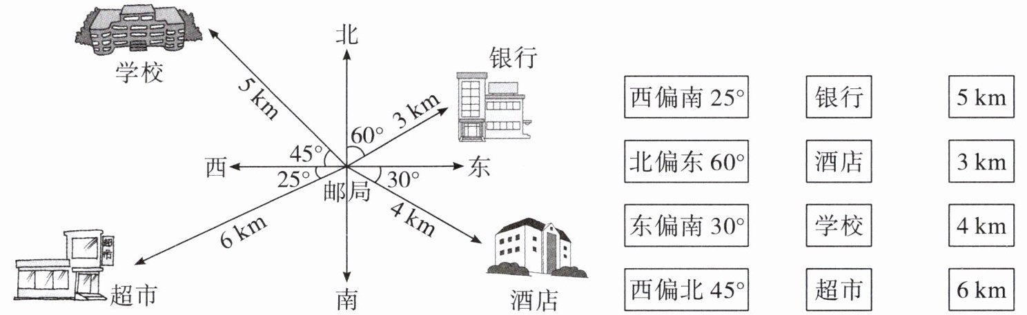 西偏南25° 银行 5 km 北偏东60° 酒店 3 km 东偏南30° 学校 4 km
