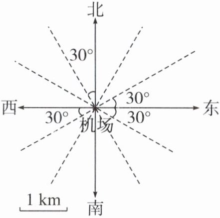 根据比例尺1 cm : 1 km,先确定各点距离观测点(机场)的厘米数,再根据方向在图中标出位置: