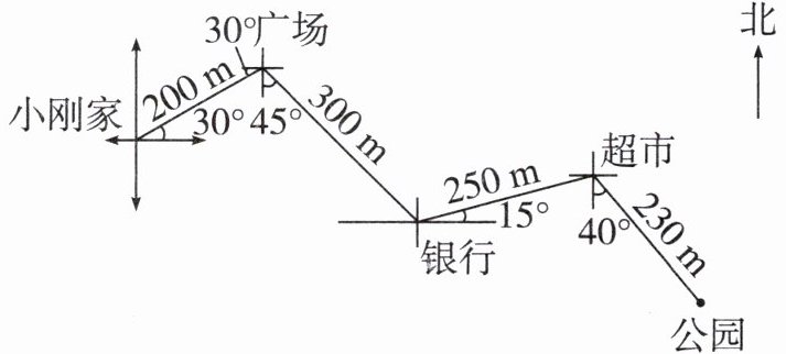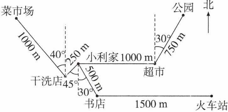 1. 先向东走1000m到达超市,再向北偏东30°方向走750m到达公园。2. 先向南偏东30°方向走500m到达书店,再向东走1500m到达火车站。3. 先向南偏西45°方向走250m到达干洗店,再向北偏西40°方向走1000m到达菜市场。
