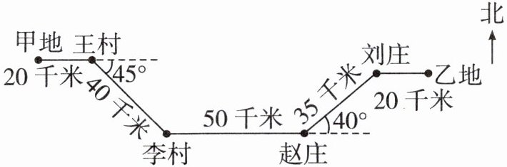 (1)从甲地先向东行驶20km到达王村,再向东偏南45°方向行驶40km到达李村,再向东行驶50km到达赵庄,再向东偏北40°方向行驶35km到达刘庄,最后向东行驶20km到达乙地。