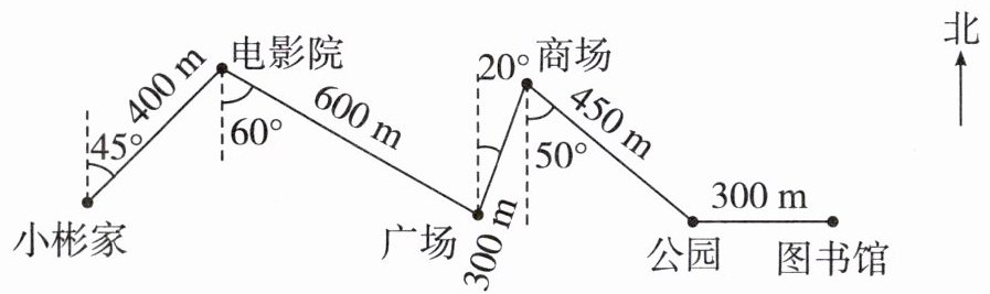 (1)从家先向北偏东45°方向走400m到达电影院,再向南偏东60°方向走600m到达广场,再向北偏东20°方向走300m到达商场,再向南偏东50°方向走450m到达公园,最后向东走300m到达图书馆。