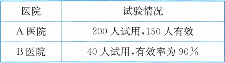 某药厂研制了一种抗流感的新药,在两家医院进行了临床试验(下表所示),从试验情况可以看出这种药在 A 医院的有效率为(