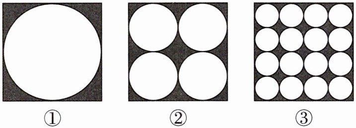 5. 三块边长都为$12\mathrm{cm}$的正方形铁皮,分别按下图方式剪下不同规格的圆片,请你算一算哪块铁皮剩下的废料多。
