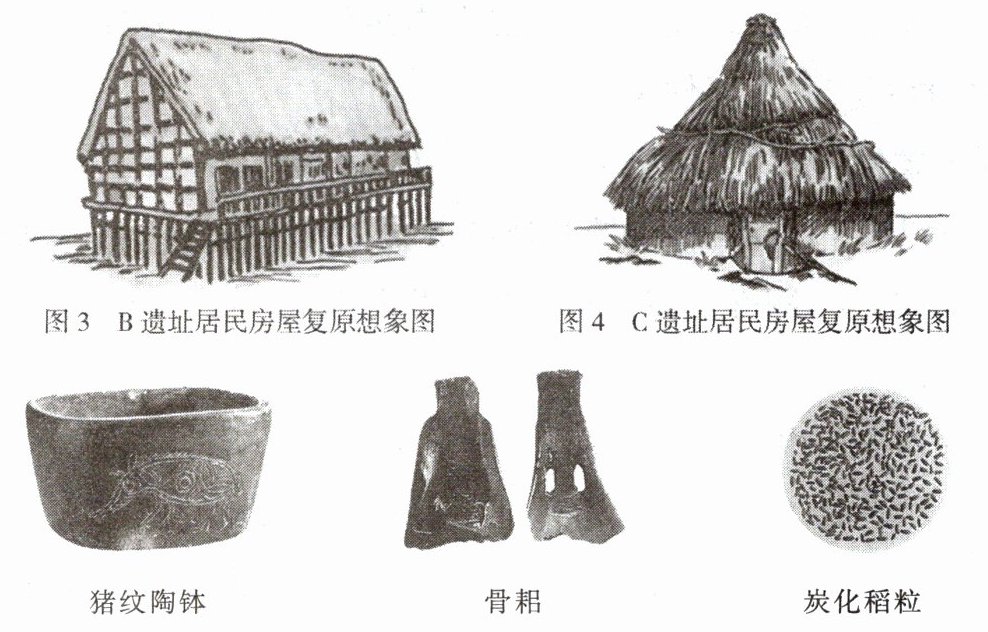 (2)材料二是某同学搜集的反映河姆渡人生产、生活的图片。请你仿照范例,完成剩余两幅图片的考证。
