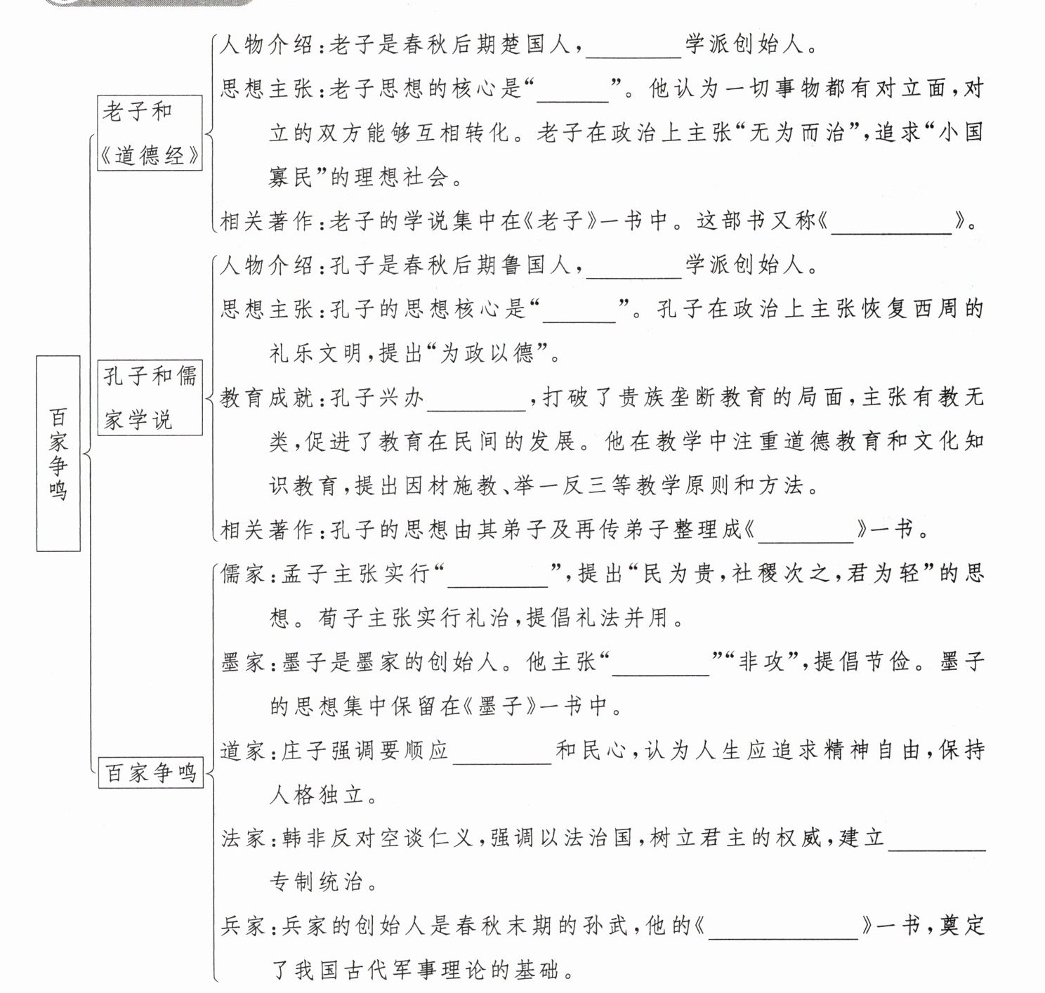 │ ├─思想主张:老子思想的核心是“______”。他认为一切事物都有对立面,对立的双方能够互相转化。老子在政治上主张“无为而治”,追求“小国寡民”的理想社会。