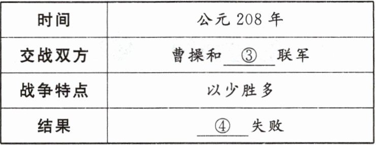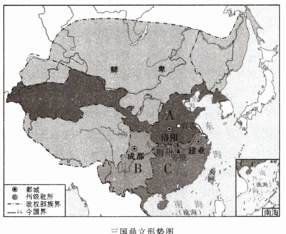 (2)A.魏;B.蜀;C.吴。赤壁之战对当时整个局势有关键性的影响,为三国鼎立局面的形成奠定基础。
