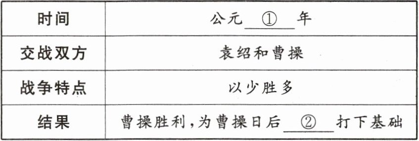 (1)笔记一:官渡之战。笔记二:赤壁之战。①200;②统一北方;③孙刘;④曹操。
