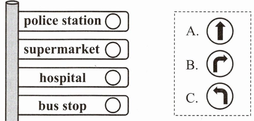 Toby 看到了指示牌。听录音,找到对应的方向指示,将字母序号填在指示牌上的圆圈内。