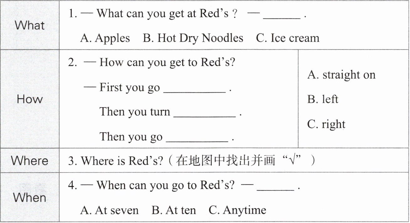 Toby 一直很想尝尝武汉的特产热干面 (Hot Dry Noodles),这时他看到了火车站广场 LED 显示屏上的“火记 (Red’s) 热干面”广告。请根据广告信息,选择合适的选项填在横线上,完成表格。