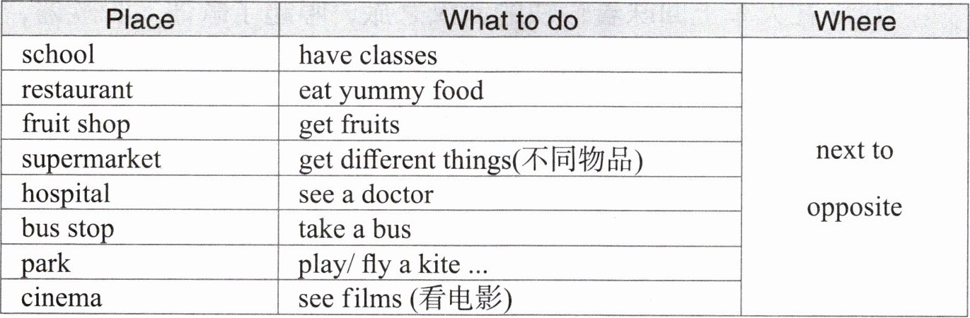 Toby 的新朋友 Zhang Fan 绘制了一张她家附近区域的地图。请你根据地图和表格中的内容,帮她补全文字介绍吧!