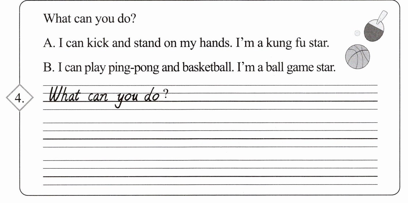 4. What can you do? A. I can kick and stand on my hands. I'm a kung fu star. B. I can play ping-pong and basketball. I'm a ball game star. What can you do?