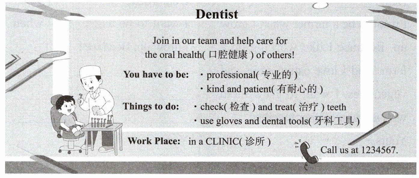 小镇正在招聘牙医(dentist)。根据招聘海报提供的信息,完成下面的表格。