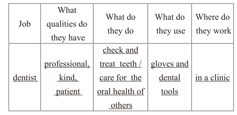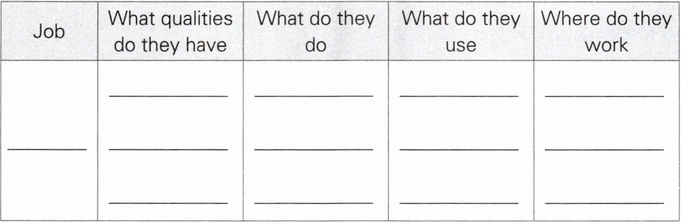| Job | What qualities do they have | What do they do | What do they use | Where do they work |