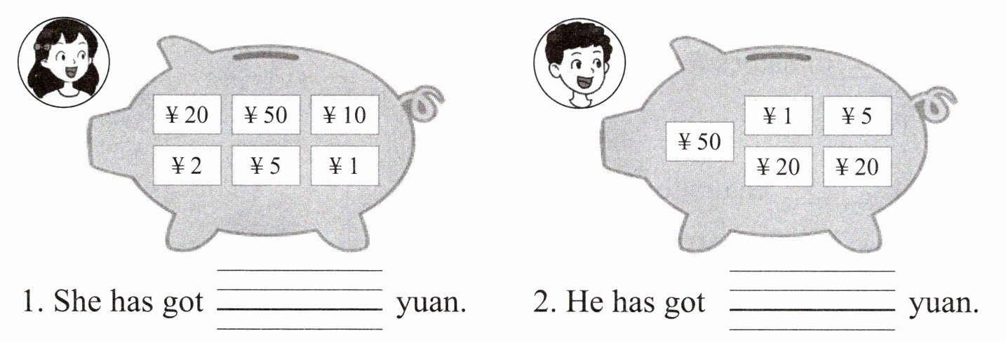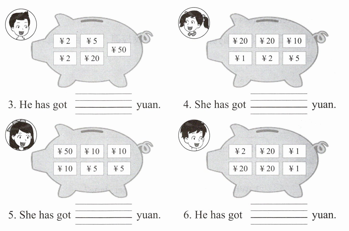 小朋友们的存钱罐里有多少钱呢?算一算,将对应的单词写在四线格里。