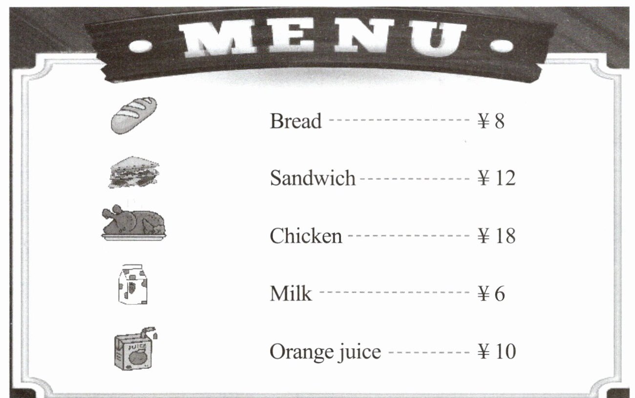 Nana 到快餐店吃午餐。根据菜单提供的信息,选择正确的选项,将字母序号填在题前的括号里。