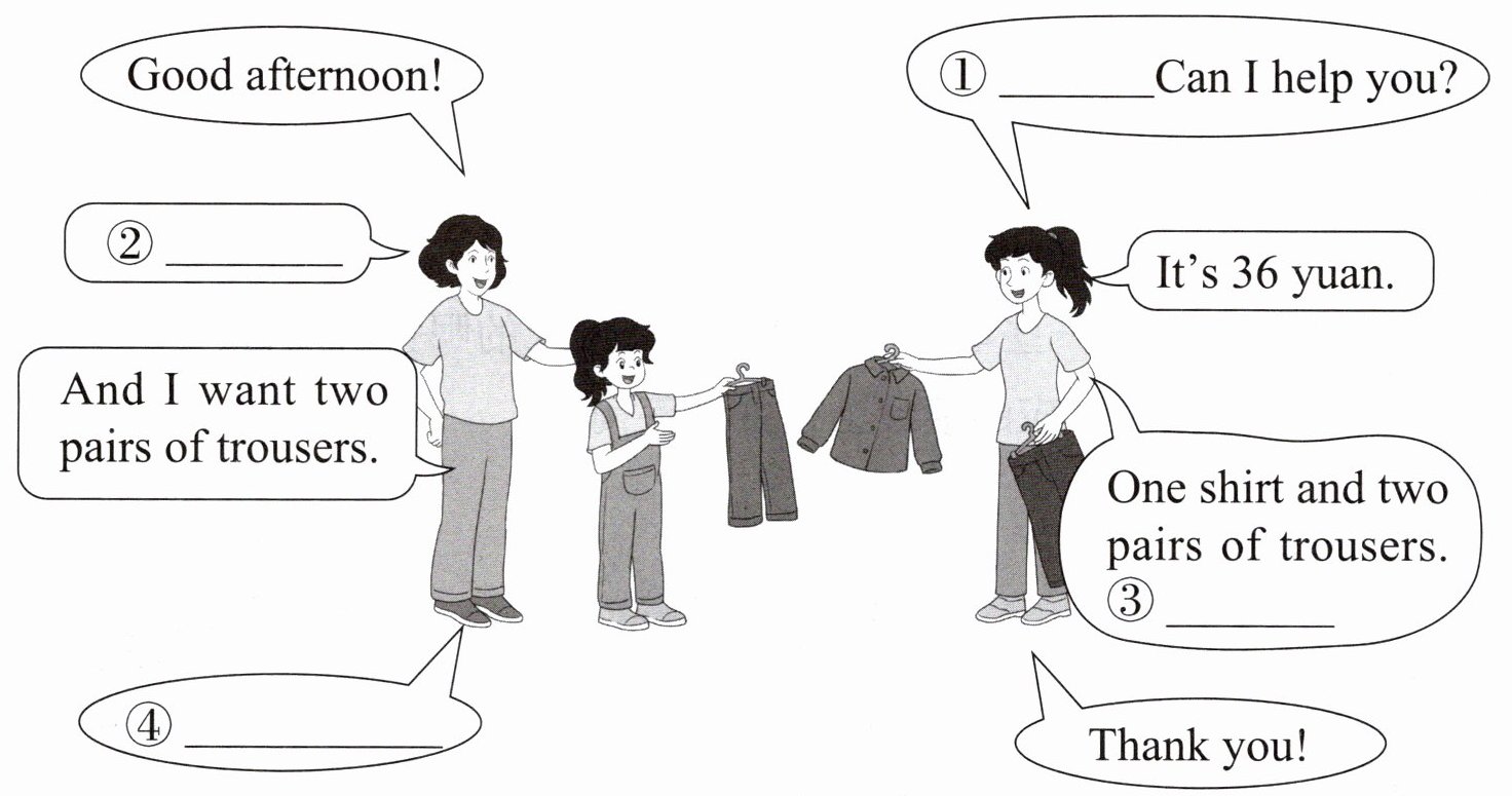 1. Nana 和妈妈到服装店买衣服。选择正确的选项,将其字母序号写在对应的横线上,补全对话。