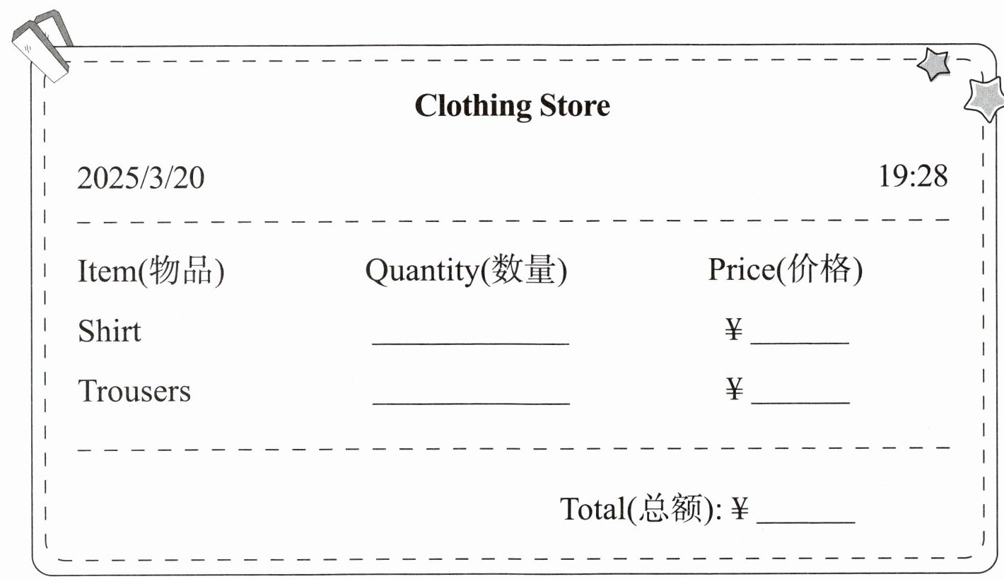 2. 根据对话内容,将阿拉伯数字填写在对应的横线上,补全购物小票。