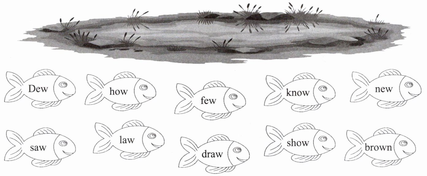 Tutu 和爸爸一起到河边钓鱼。听录音,根据听到的单词圈出 Tutu 钓到的鱼。